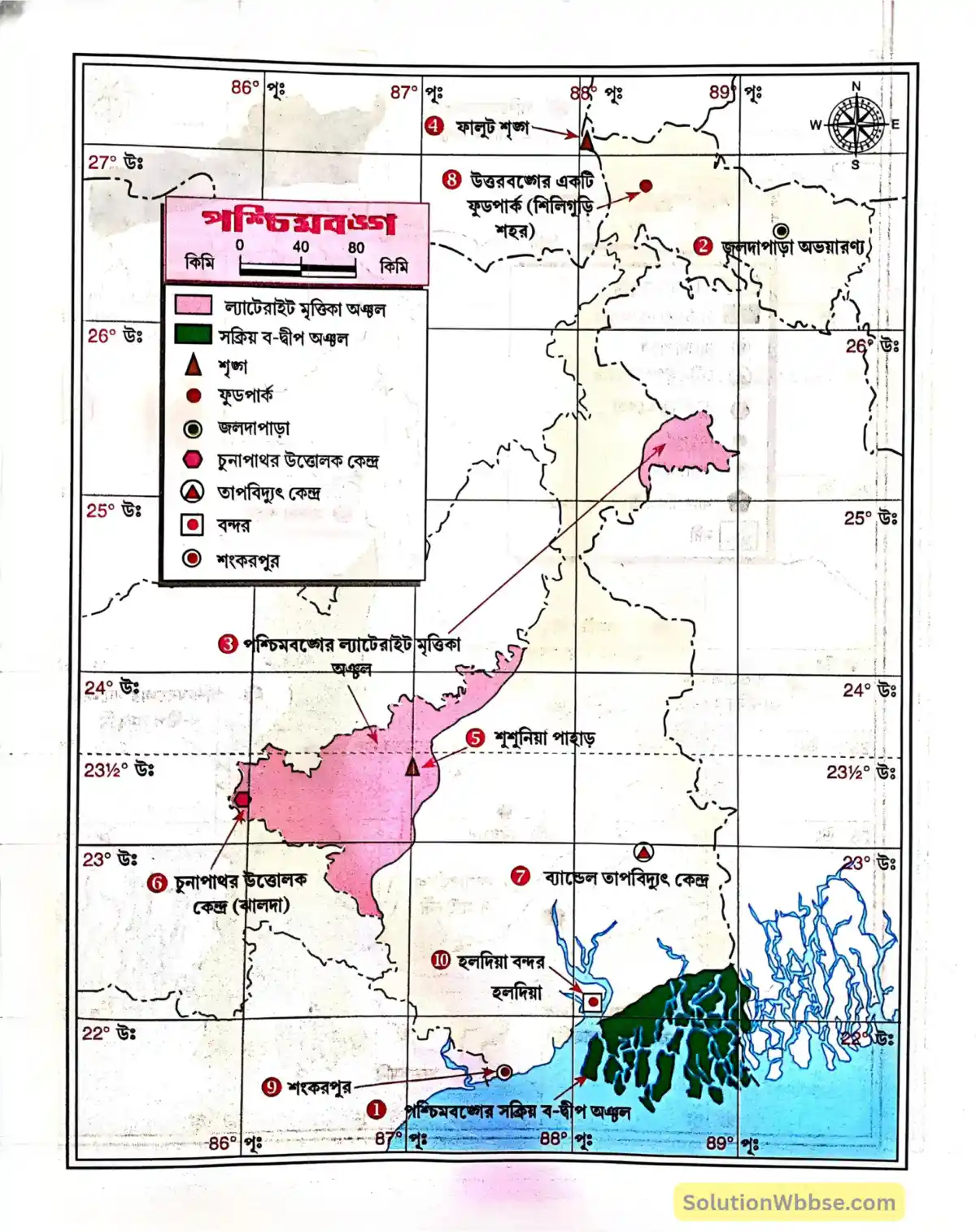 প্রদত্ত পশ্চিমবঙ্গের রেখা মানচিত্রে নিম্নলিখিত বিষয়গুলি উপযুক্ত প্রতীক ও নামসহ চিহ্নিত করো।