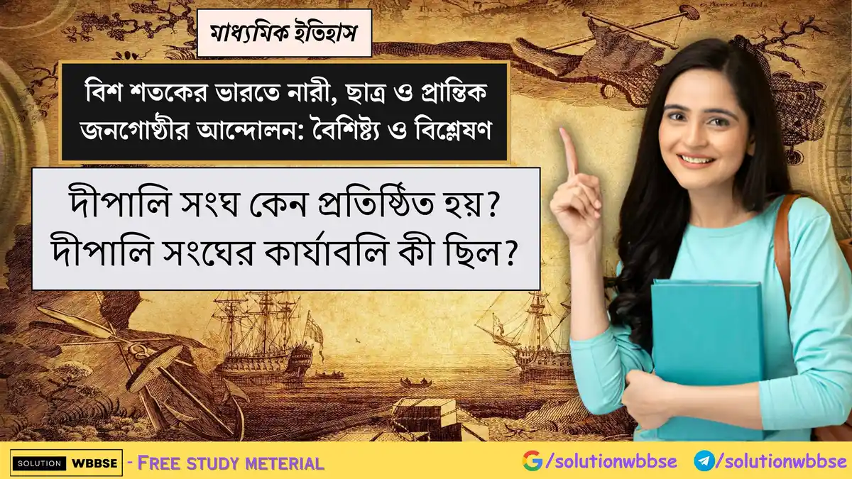 এই আর্টিকেলে আমরা মাধ্যমিক ইতিহাসের একটি গুরুত্বপূর্ণ প্রশ্ন “দীপালি সংঘ কেন প্রতিষ্ঠিত হয়? দীপালি সংঘের কার্যাবলি কী ছিল?” নিয়ে আলোচনা করব। এই প্রশ্নটি মাধ্যমিক ইতিহাস পরীক্ষার জন্য অত্যন্ত গুরুত্বপূর্ণ। এই “দীপালি সংঘ কেন প্রতিষ্ঠিত হয়? দীপালি সংঘের কার্যাবলি কী ছিল?” প্রশ্নটি মাধ্যমিক ইতিহাসের সপ্তম অধ্যায় “বিশ শতকের ভারতে নারী, ছাত্র ও প্রান্তিক জনগোষ্ঠীর আন্দোলন: বৈশিষ্ট্য ও বিশ্লেষণ“ -এর একটি গুরুত্বপূর্ণ প্রশ্ন। এই প্রশ্নটি মাধ্যমিক পরীক্ষায় এবং চাকরির পরীক্ষায় প্রায়ই দেখা যায়।