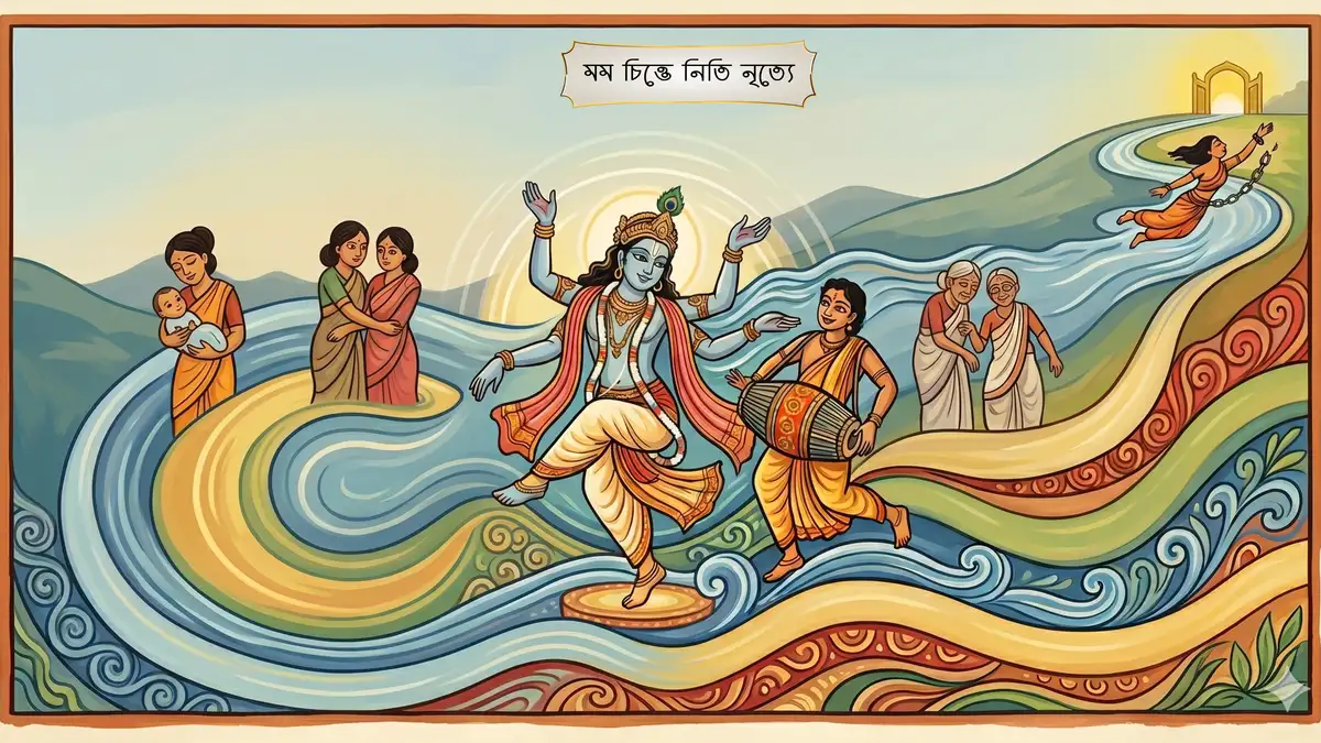 আমাদের মনে দিন-রাত কেউ একজন নাচছেন, তাঁর নাচের তালেই বাজছে মৃদঙ্গ। সেই তালে কপালে হাসি-কান্না দোল খায়, পিছন পিছন জন্মমৃত্যু, আনন্দ, মুক্তি, বন্ধন সবই নেচে চলে। সেই তরঙ্গধারায় আমরা সবাই একই তালে মনের আনন্দে সেই শেষদিনের দিকে এগিয়ে চলেছি। সেই নৃত্যের তালে আমরা অনাবিল আনন্দ অনুভব করছি।